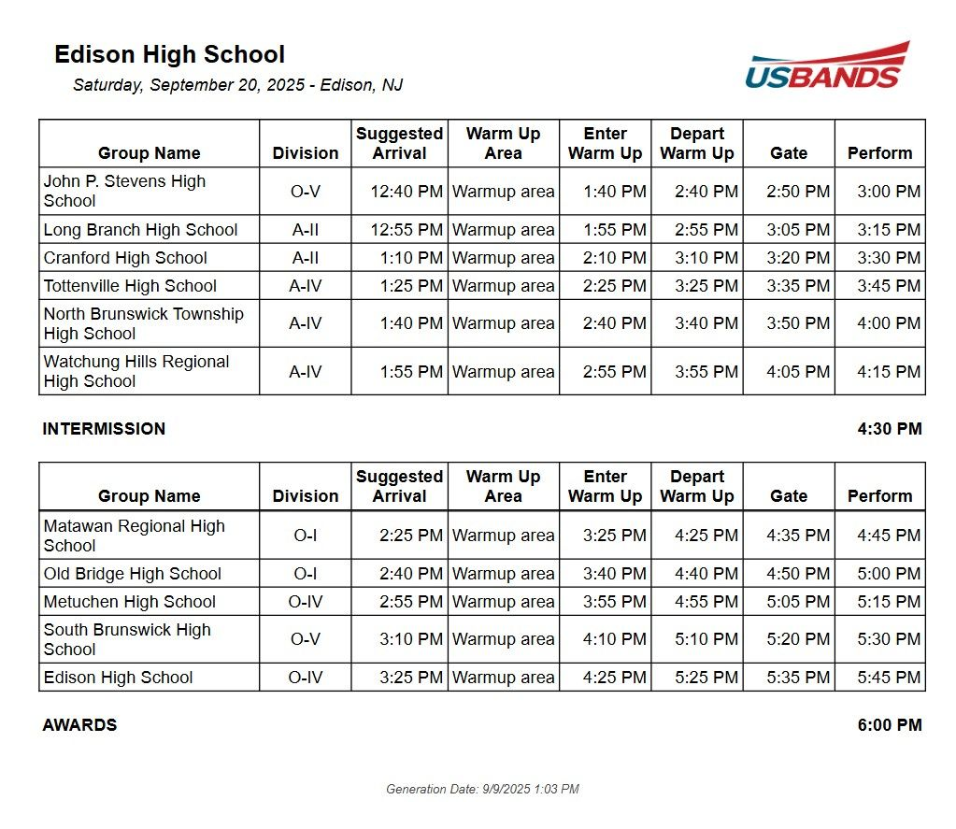 Welcome back to the annual magnificent Festival of Marching at Edison High School. We are glad to be here and proud of our championship band and excited to see everyone perform. Thanks go out to America’s best Band Parents (www.ehsbands.org), Mr. DeNicuolo, Mr. Dillman, Mr. O’Leary, all the other staff and most of all to our new and returning Marching Eagles. I am so proud of all the work that has put this show together. No group works as hard as our band and band parents. Please get some food at the snack shack while you are here and support our vendors. Go eat!